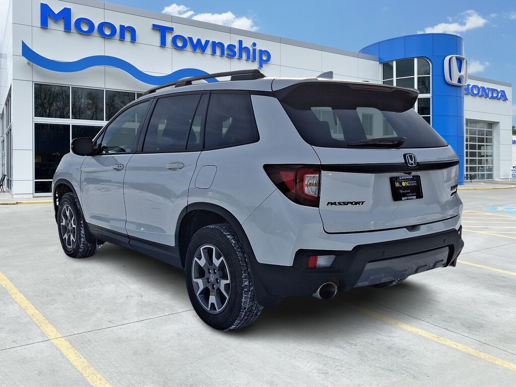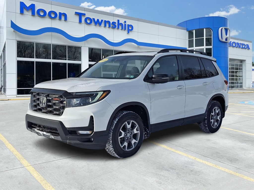 Recent Arrival! 2022 Honda Passport TrailSport Platinum White Pearl BOUGHT, SERVICED AND TRADED AT MOON TOWNSHIP HONDA, RECENT TRADE IN, SERVICE RECORDS AVAILABLE, NAVIGATION GPS NAV, MOONROOF SUNROOF, LEATHER, REMAINDER OF FACTORY WARRANTY, INCLUDES WARRANTY, 4-Wheel Disc Brakes, 7 Speakers, A/V remote: CabinControl, ABS brakes, Alloy wheels, AM/FM radio: SiriusXM, Apple CarPlay/Android Auto, Auto High-beam Headlights, Auto-dimming Rear-View mirror, Automatic temperature control, Blind Spot Information (BSI) System warning, Brake assist, Bumpers: body-color, Compass, Delay-off headlights, Dual front impact airbags, Dual front side impact airbags, Electronic Stability Control, Emergency communication system: HondaLink Assist, Exterior Parking Camera Rear, Forward collision: Collision Mitigation Braking System (CMBS) + FCW mitigation, Four wheel independent suspension, Front anti-roll bar, Front dual zone A/C, Front fog lights, Fully automatic headlights, Garage door transmitter: HomeLink, Heated door mirrors, Heated Front Bucket Seats, Heated front seats, Illuminated entry, Lane departure: Lane Keeping Assist System (LKAS) active, Leather-Trimmed Seats w/Orange Stitching, Low tire pressure warning, Memory seat, Navigation system: Honda Satellite-Linked Navigation System, Occupant sensing airbag, Outside temperature display, Overhead airbag, Panic alarm, Power door mirrors, Power driver seat, Power Liftgate, Power moonroof, Power passenger seat, Radio data system, Radio: 215-Watt Audio System w/7 Speakers, Rear air conditioning, Rear anti-roll bar, Rear window wiper, Remote keyless entry, Roof rack: rails only, Security system, Speed-sensing steering, Split folding rear seat, Spoiler, Steering wheel mounted audio controls, Tachometer, Telescoping steering wheel, Traction control, Turn signal indicator mirrors, Variably intermittent wipers, Wheels: 18" Machine-Finish Alloy. CARFAX One-Owner.